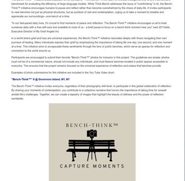 By submitting your media, you grant Bench-Think™ and My Grief Angels Inc, its affiliates, agents, partners, and licensees a perpetual, irrevocable, worldwide, royalty-free, and non-exclusive license to use, reproduce, modify, adapt, publish, translate, create derivative works from, distribute, and display your submitted media in any and all media channels now known or hereafter developed. This includes, but is not limited to, use in advertising, trade, promotion, exhibition, or any other lawful purpose related to the Project.